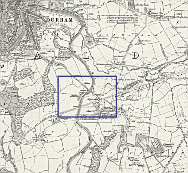 One and a half miles South West of Durham, Shincliffe medieval bridge was approx.100 yards upstream of the present bridge on the A177 (Stockton – Durham) road shown below on the 1st ed. OS 6 inch (1857). (Fig. 1)
