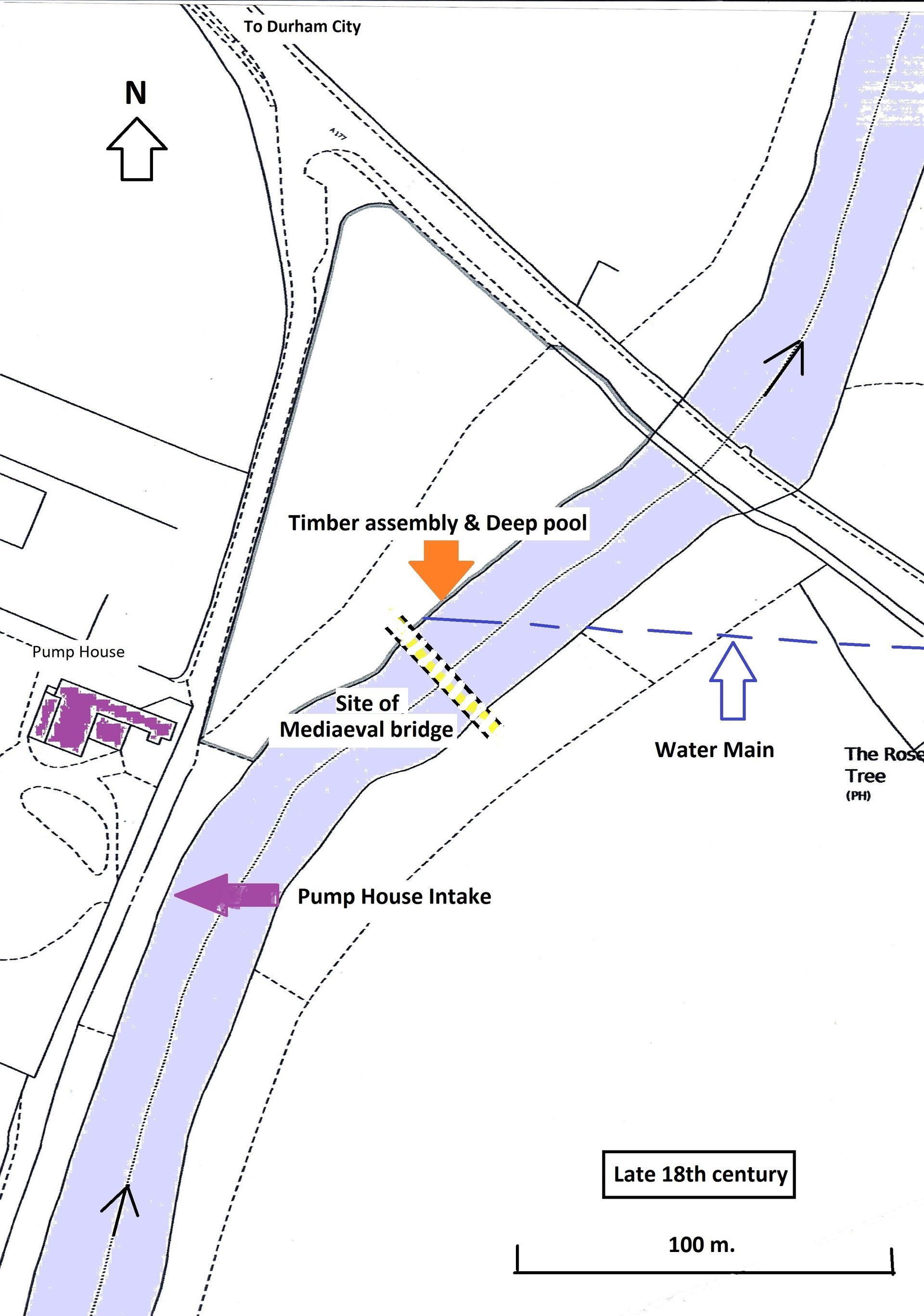 Between the mediaeval bridge site and the location of the timber structure there is the remains of a water main which was built in the 1870’s diagonally across towards the Rose Tree pub to supply Shincliffe and the area eastwards. This water main involved a lot of brickwork to protect the riverbank and there are indications of a low brick wall just underwater which may have carried or protected the pipe across the river.