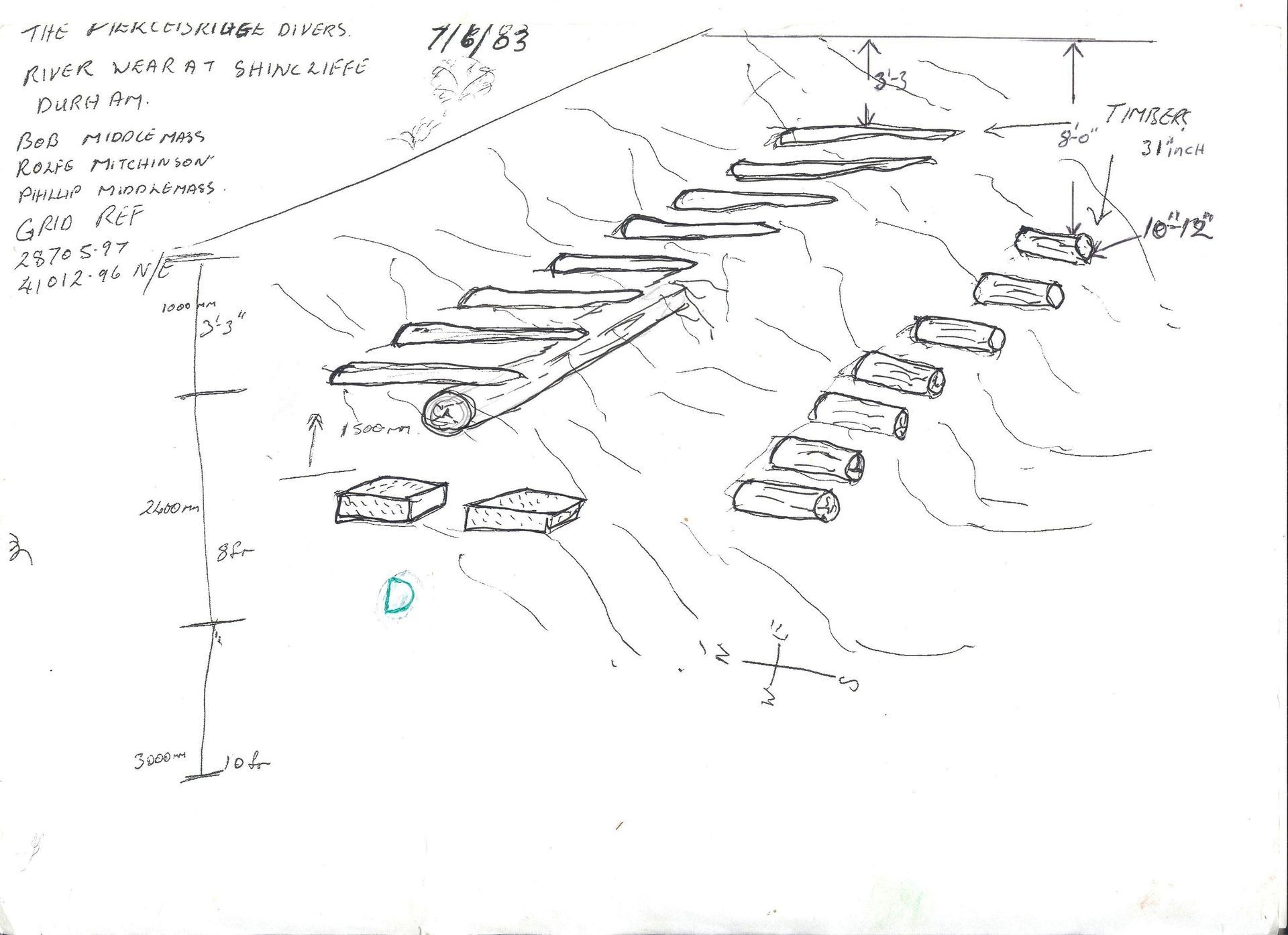 Fig. 5 Below left: Sketch of the timber assembly made by the Piercebridge Divers in June 1983.