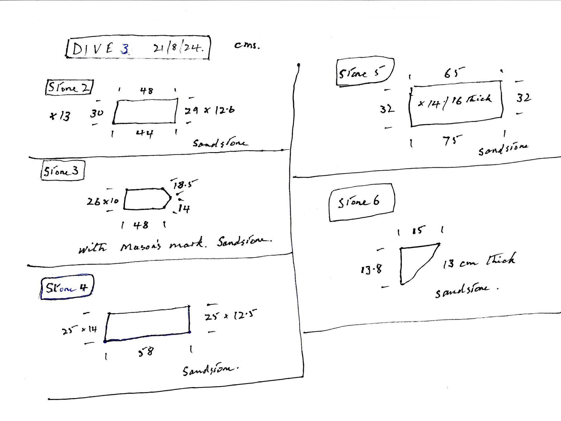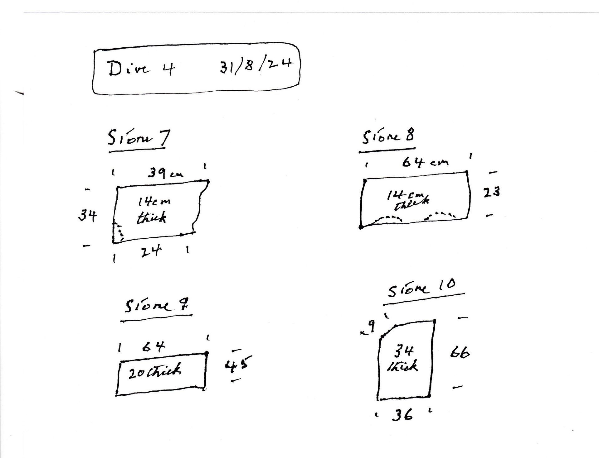Dive 4 on 31.08.25 recovered 4 stones, (see sketch, right, for dimensions and images below).