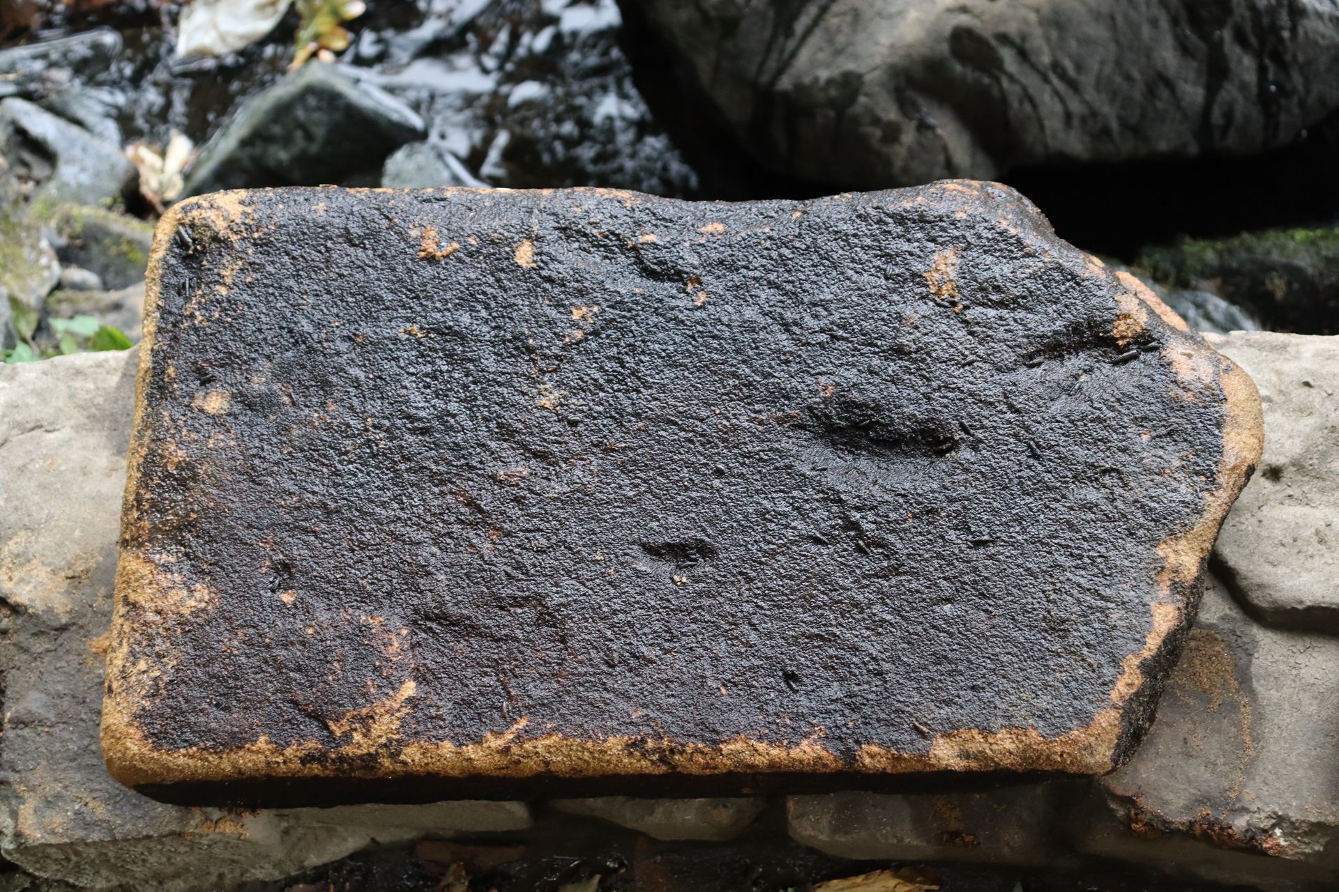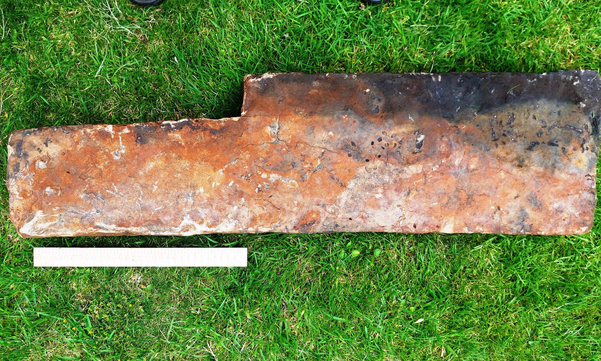 The reasonably smooth surface of this sandstone block, shown above, has a dark section from exposure on the surface shown. The reverse side and the edges are also dark.